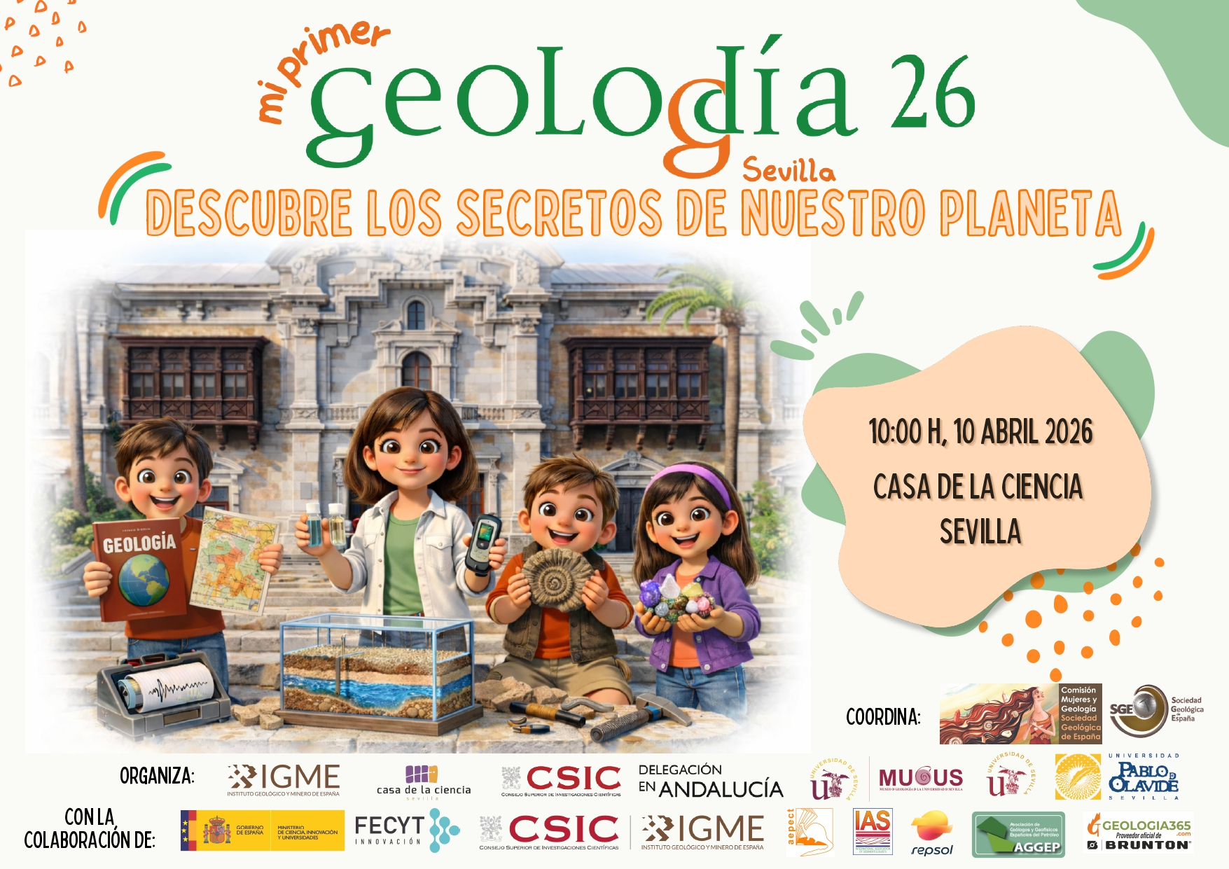 Mi Primer Geolodía es una actividad incluida en el Proyecto Geolodía que está dirigida al público más joven (alumnado de infantil y primaria) que se celebra el 10 de abril en horario de 10 a 13 horas en la Casa de la Ciencia de Sevilla.