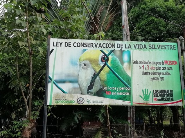 Cartel advirtiendo de las sanciones por capturar loros de origen salvaje. Crédito: Pedro Romero Vidal.
