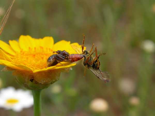 Una araña cangrejo, Synaema globossum, se alimenta de una abeja polinizadora. / Foto: Eva de Mas, CSIC.