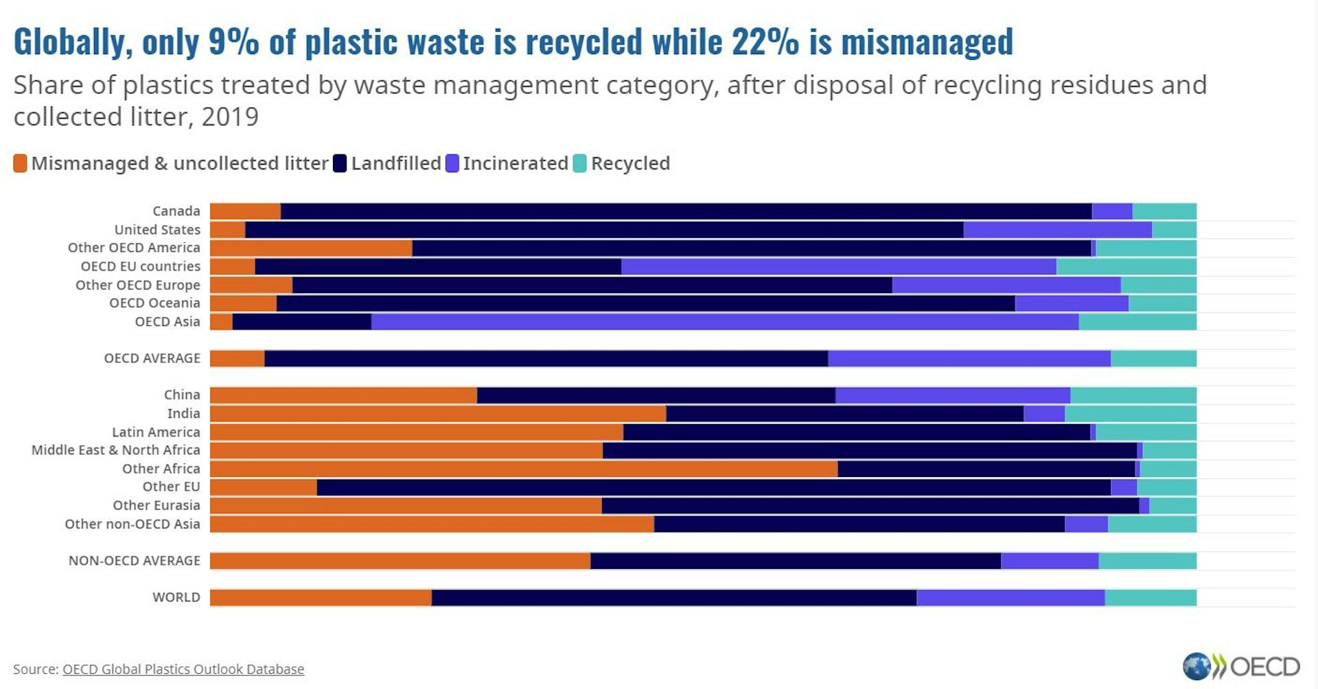Más del 22 % del plástico a nivel global sigue sin ser gestionado correctamente y acaba en el medio ambiente. OECD