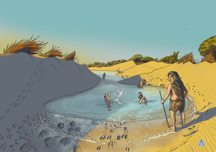 Las pisadas se encuentran repartidas a lo largo de una franja en dirección NO-SE, al borde de lo que fue una zona inundada, probablemente estacional, y sin apenas adentrarse en el agua. Se orientan en su mayoría perpendicularmente a la dirección anterior, por lo que las hipótesis más factibles serían la caza, acechando animales en el agua. Probablemente no los grandes artiodáctilos (ciervos, jabalíes) o proboscídeos (elefantes), sino aves acuáticas o limícolas o incluso pequeños carnívoros, o bien la pesca o la búsqueda de moluscos y crustáceos.