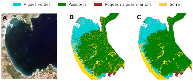 Por último, debemos ver si todo este esfuerzo ha servido de algo. Pues, como suele decirse, vale más una imagen que mil palabras. En la figura A observamos una imagen de satélite de la bahía de Pollensa, mientras que en la figura B observamos su fondo marino cartografiado. Nuestro modelo de inteligencia artificial es capaz de generar la cartografía mostrada en la figura C a partir de la imagen de satélite. Increíble, ¿no? ¡Las dos imágenes parecen idénticas!