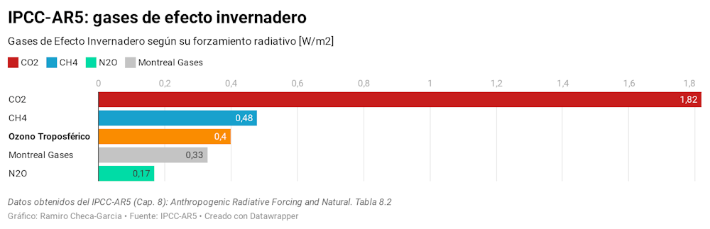 En el último informe del IPCC se ha estimado un forzamiento radiativo de gases de efecto invernadero que, sin incluir el ozono, es cercano a 3 W/m2. La contribución del ozono en la troposfera se estima entorno a 0,4 W/m2, una cifra muy relevante.