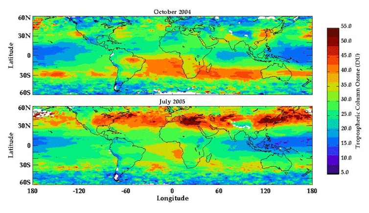 Las diferencias geográficas y estacionales se pueden apreciar en las estimaciones obtenidas por el satélite Aura, que muestran una banda con altas concentraciones en China, Europa y Norteamérica.