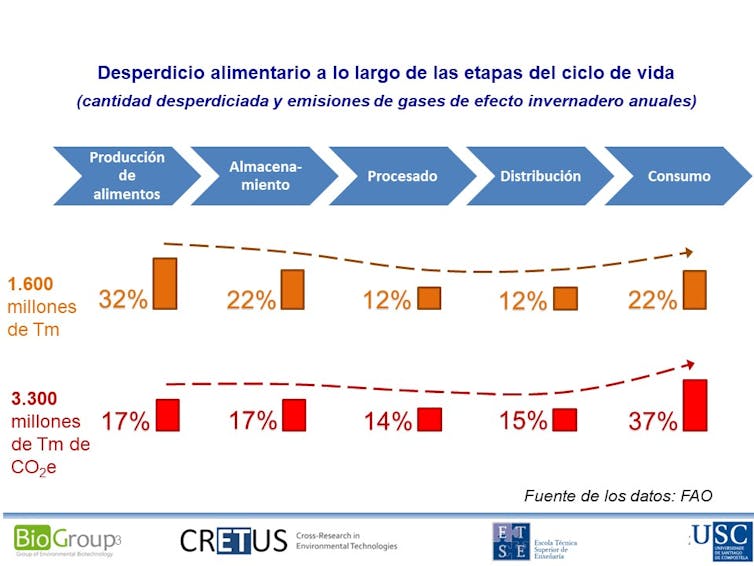 El despilfarro varía a lo largo de las etapas de ciclo de vida de los alimentos. En la etapa de consumo la cantidad de alimentos desperdiciada supone un 22 % del total, pero el volumen de emisiones de CO₂ que genera no es lineal. Se produce un efecto multiplicador, de forma que representa un 37 % de emisiones en relación al resto de etapas de la cadena de valor.